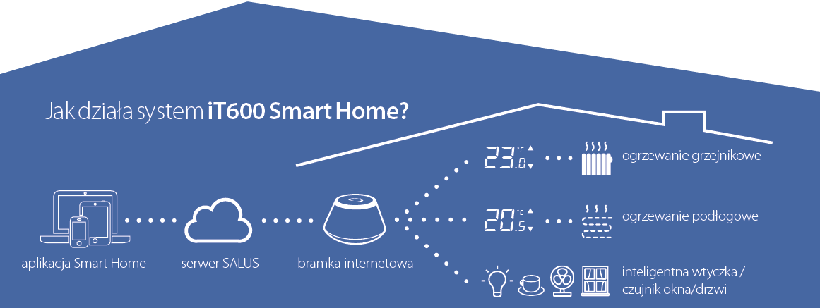 Darmowa aplikacja internetowa SALUS Smart Home umożliwia sterowania systemem ogrzewania z każdego miejsca na świecie. Aplikacja jest prosta w instalacji i obsłudze. Dzięki niej mamy sposobność nadzorowania systemu ogrzewania przez cały czas. W przypadku zaistnienia zmian w jego pracy, zostaniemy o tym poinformowani mailem lub SMS-em. Przykładowo, gdy ktoś otworzy okno lub drzwi, system zamelduje nam o tym. Dodatkowo możemy prześledzić historię pracy czujnika. Mamy też opcję zarządzania kilkoma systemami sterowania ogrzewaniem naraz, co jest bardzo przydatne w przypadku budynków wielorodzinnych, domów wczasowych czy hoteli. Tworząc reguły i zależności pomiędzy urządzeniami lub stanami urządzeń w aplikacji SALUS Smart Home, można stworzyć własną bazę inteligentnego budynku. Używając inteligentnych wtyczek poprzez aplikację możemy też na bieżąco kontrolować zużycie energii.